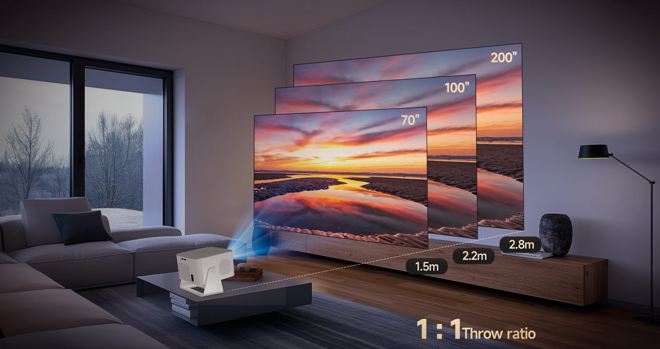 Perfect for compact living areas. With a 1:1 throw ratio, you can get a large-screen cinematic experience from just 1.35 meters (about 4.4 ft) away. Great for apartments, bedrooms, dorms, or any spontaneous movie night.